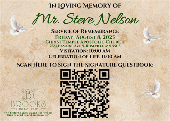 Brooks Funeral Home announces the passing of Mr. Steve Nelson, who was called into eternal rest on Wednesday, July 2, 2025. Celebration of Life will be held on Friday, August 8, 2025 at 11:00 AM at Christ Temple Apostolic Church, Read Obituary
